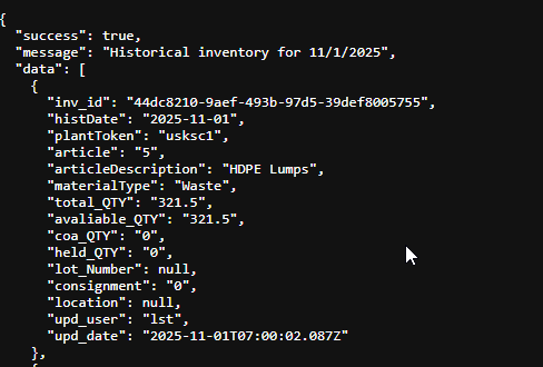 Good way http://usksc1vms006:3000/api/eom/histinv?month=11/1/2025